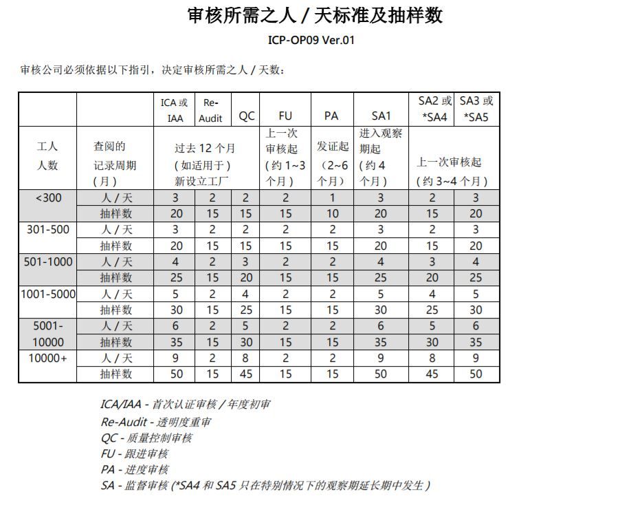 稽核所需之人/天標準及抽樣數,可參考下表: