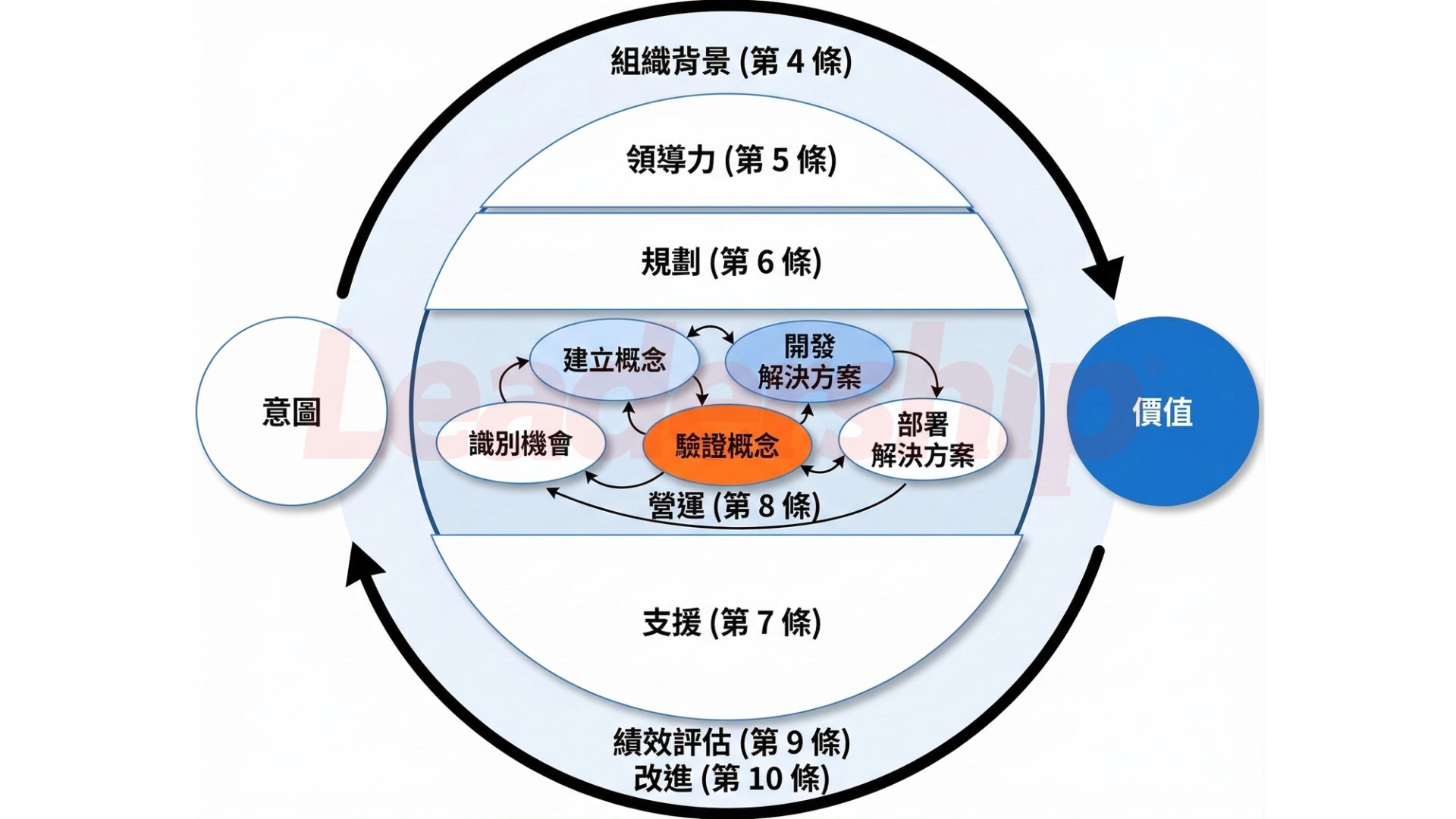 | Do (執行) | 條款 7-8:支援與營運 | 配置預算與實驗時間,執行「識別機會 → 創造概念 → 驗證 PoC → 開發部署」的核心流程。 |