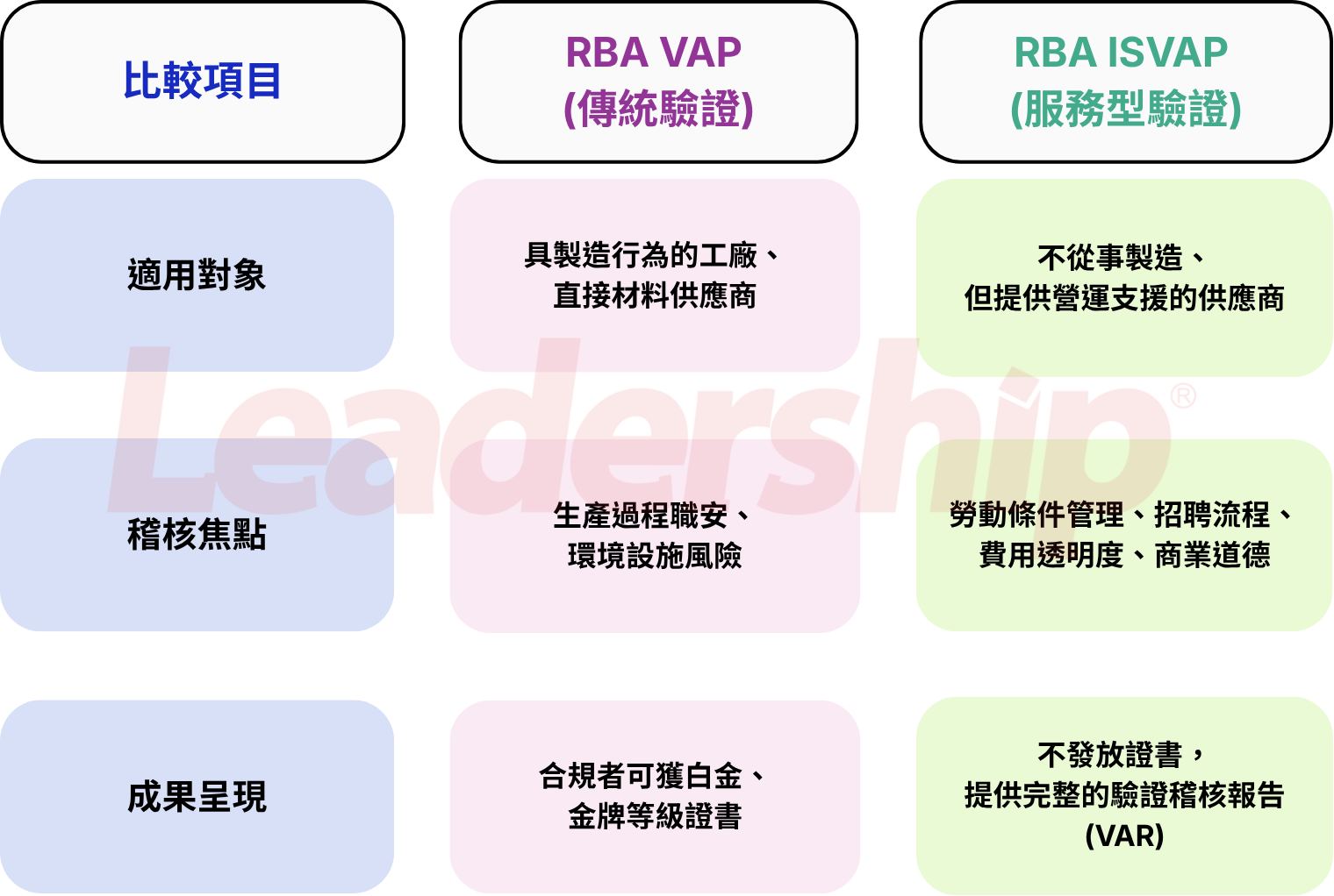 ISVAP 同樣以 RBA 行為準則為基礎,稽核流程亦包含自評、第三方驗證、改善與追蹤。但在適用對象與成果呈現上有明確區別: