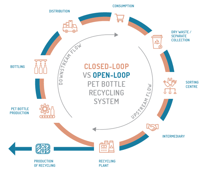 • Closed Loop(閉環回收): 理想的循環模式。回收後的材料再次製成相同用途產品(如寶特瓶變寶特瓶),能長期維持材料價值與品質。