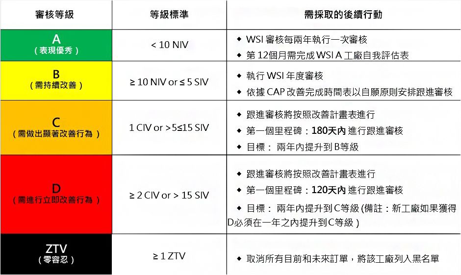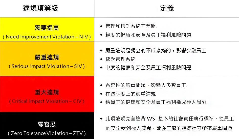 以「審核標的」而言,其實 WSI 驗廠內容與 SEDEX SMETA Pillar4 相近,但 WSI 社會責任驗廠有自己獨特的「審核違規項等級」以及「審核評級標準」。